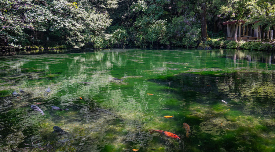 水の清らかさと池周辺の風景が印象派絵画のようだと、絵画ファンや写真ファンから人気の湧水池。 周囲約138m、古生層の石灰岩を溶解して出来た洞穴から湧き出る清水による池で、年間を通しての一定の湧水量と水温16度は変わらず、出流川の源となっている。 湧水を持ち帰るときは、隣のホテル一乃館の脇でいただくこともできる。